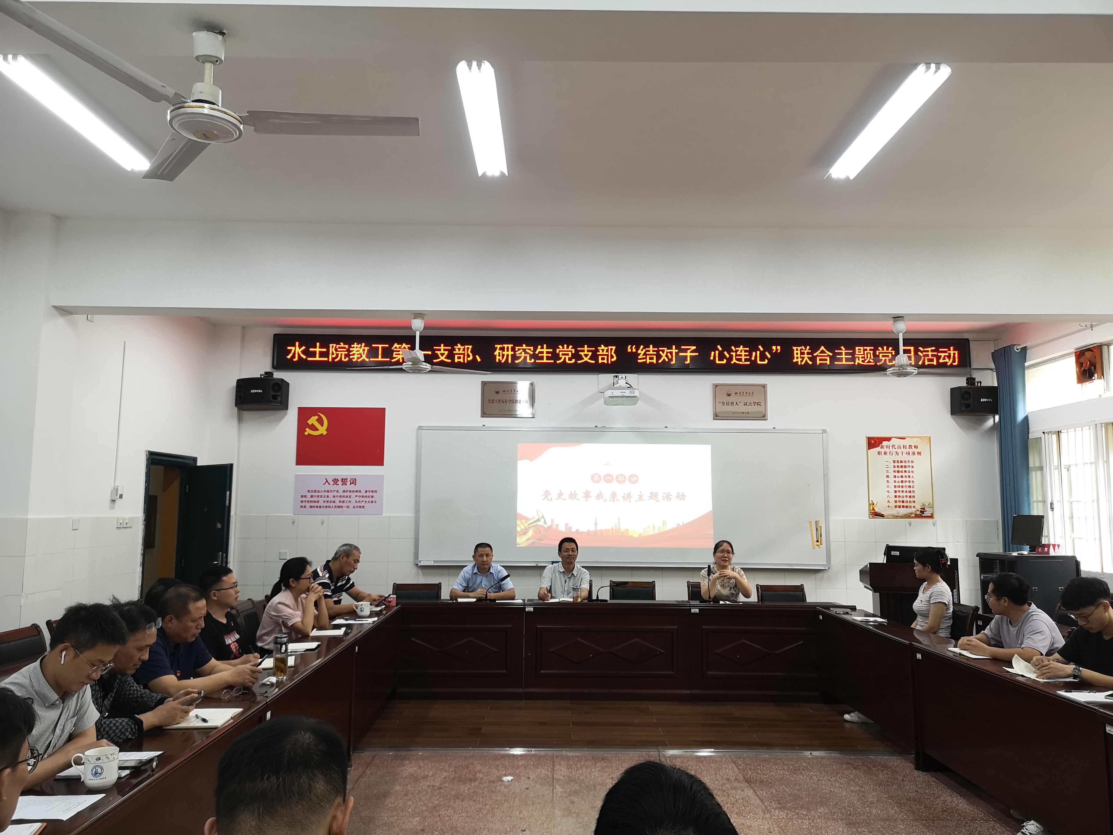 (通讯员 潘景副)2022年5月30日下午2:30,学院教工第一党支部、研究生党支部在八教南216会议室开展“结对子·心连心”联合主题党日活动。活动围绕“党史故事我来讲”、集体过“政治生日”、重温入党誓词、开展“忆初心、话未来”面对面座谈会来开展。由教工第一党支部书记张文萍主持。