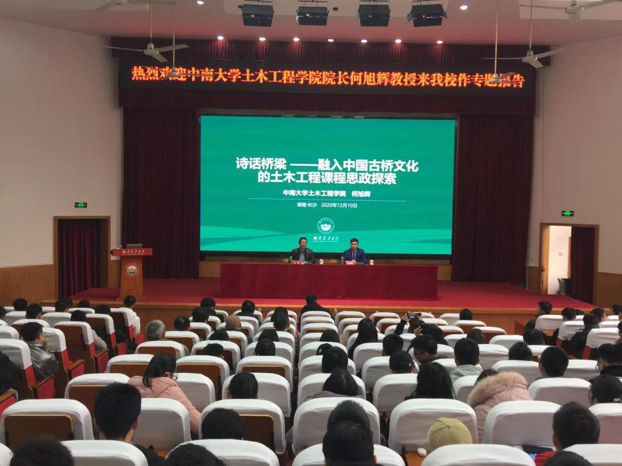 本网讯(水利与土木工程学院 李华欣 翟光辉)12月10日下午,中南大学土木工程学院院长何旭辉教授应邀做客湖南农业大学学术科技节,在修业讲堂作题为《诗话桥梁——融入中国古桥文化的土木工程课程思政探索》专题报告。会议由水利与土木工程学院院长王辉主持,学院班子成员和300余名师生代表参加报告会。
