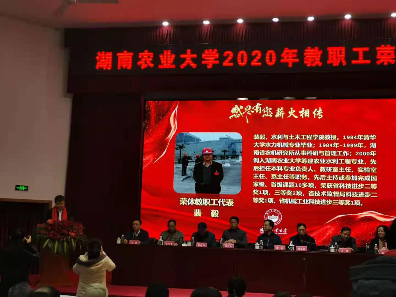 我院退休教师裴毅教授作为荣休教师代表发言,他回顾了来校20年来的任教工作经历,分享了他的两点工作感悟:一是教师是一个神圣的职业,是塑造学生灵魂的工程师,教师的一言一行都将对学生产深远影响。所以20多年来,裴教授一直敬畏讲台,敬畏课堂,做到因材施教,严格要求学生。他认为对学生的严管才是对学生的真爱。二是教书育人是教师的根本任务,如何做到“学高为师,身正为范,以行立教,以德立身”是每一教师值得深思与反省的。水利行业是一个艰苦行业,要吃得了苦,霸得了蛮,耐得住寂寞,还要有责任与担当。为此,裴教授历来注重培养学生的大格局、大情怀、大担当,努力在教学的各个环节都激励学生做到“兴水利、除水害,利天下、勇担当”。最后,裴教授表达了三个希望:一是希望师生加强身体锻炼,做到为国家健康工作50年。二是希望学校多关注中青教师的培养与成长,在住房、子女教育、职称晋升、福利待遇等方面多给与他们一些的关心、帮助和支持。三是希望学校办得越来越强大、越来越美好。