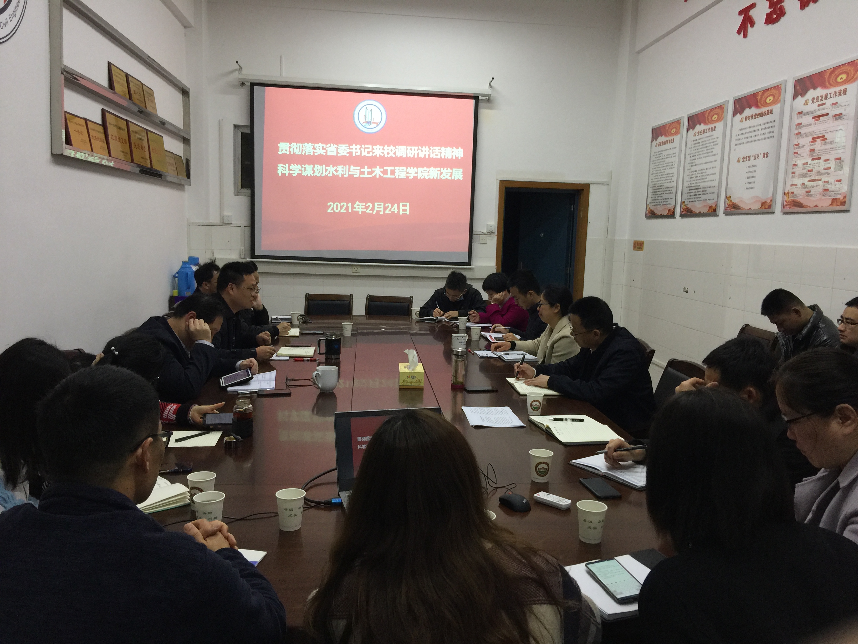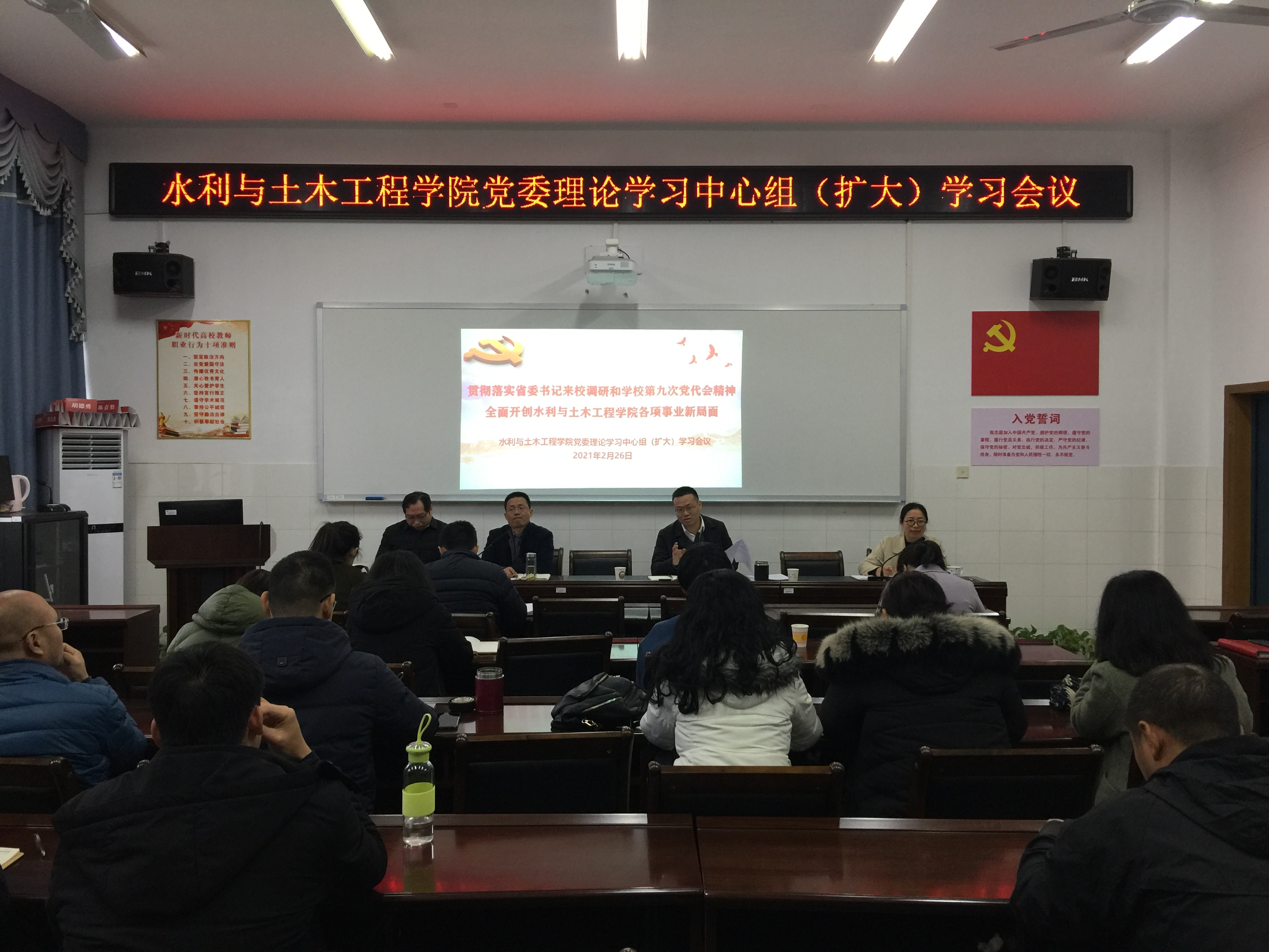 本网讯(水利与土木工程学院 翟光辉)为贯彻落实省委书记许达哲来校调研讲话精神和学校第九次党代会精神,水利与土木工程学院党委于2月24日、2月26日分别召开新学年工作务虚会和党委理论学习中心组(扩大)会议进行学习传达,并结合学院工作实际研究部署落实举措。