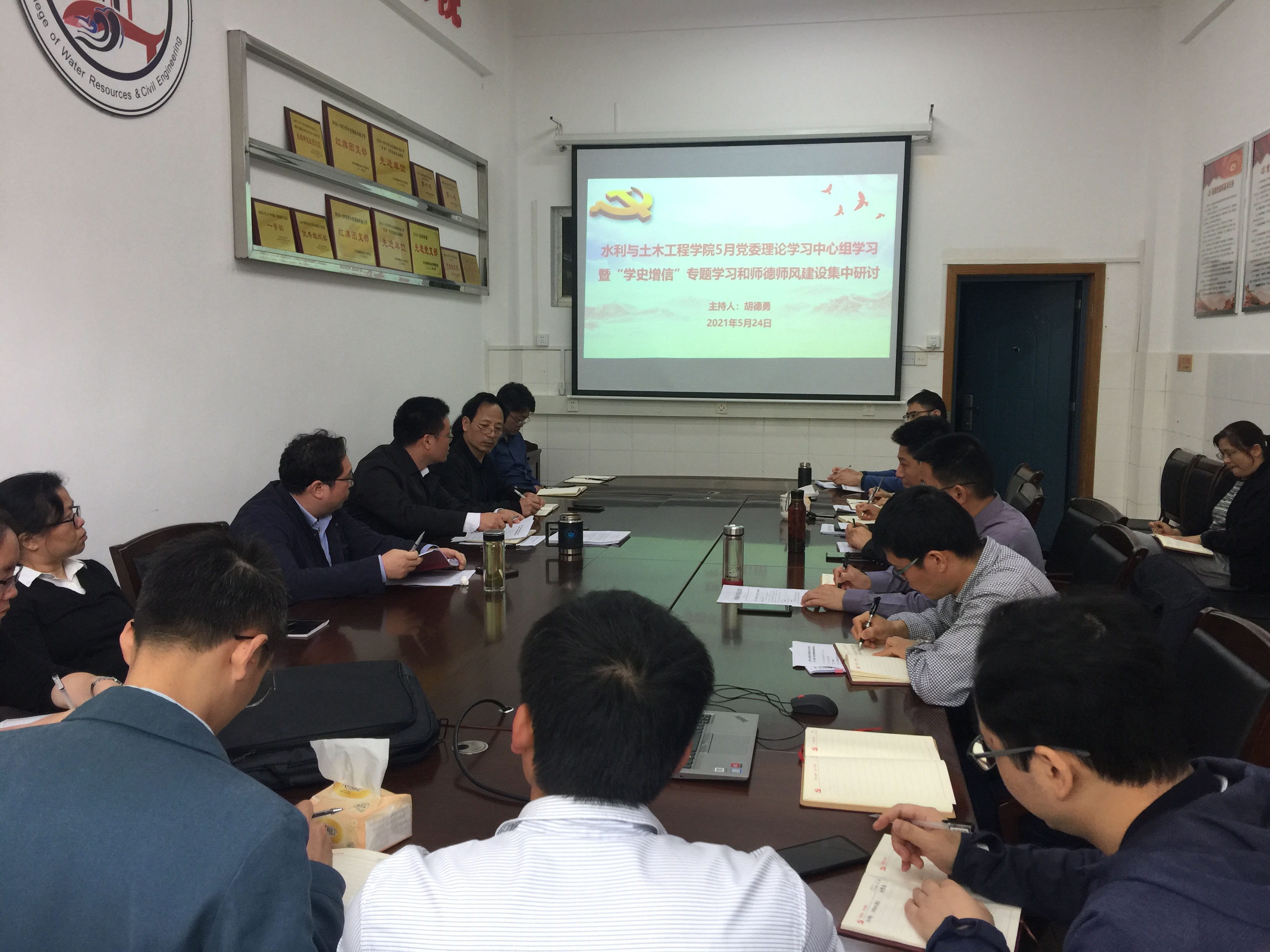 本网讯(水利与土木工程学院 翟光辉)5月24日上午,水利与土木工程学院召开党委理论学习中心组会议,以读书班的形式进行“学史崇德”专题学习和师德师风建设集中研讨。会议由学院党委书记胡德勇主持,学院党委理论学习中心组全体成员、教工党支部委员,各系(中心)正、副主任参加。