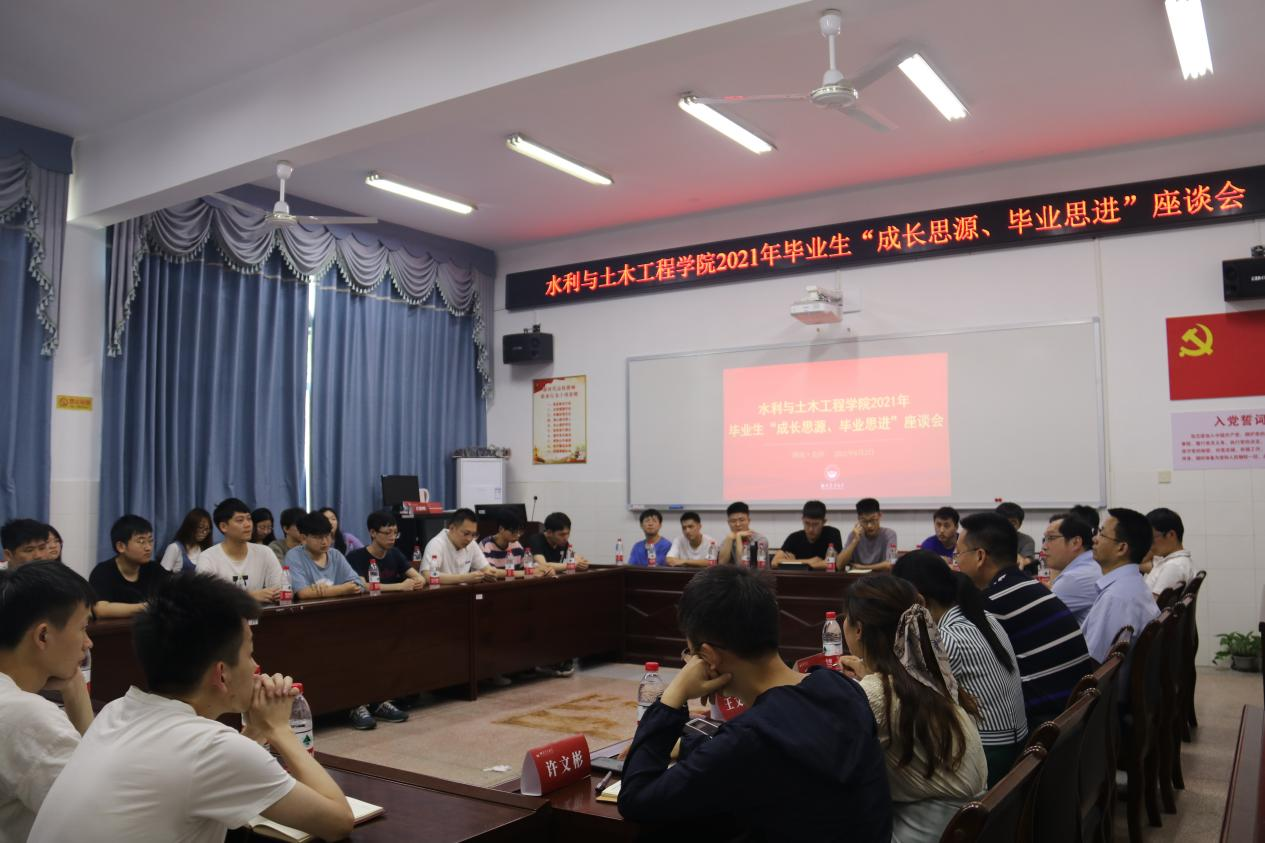 本网讯(通讯员 白东明 秦铭鑫)6月2日下午,水利与土木工程学院在八教北110会议室举行2021届毕业生“成长思源,毕业思进”主题座谈会。会议由学院党委副书记丁凯主持,学院院长王辉、党委书记胡德勇、副院长肖卫华和各系(中心)负责人出席,2021届毕业生代表参加会议。