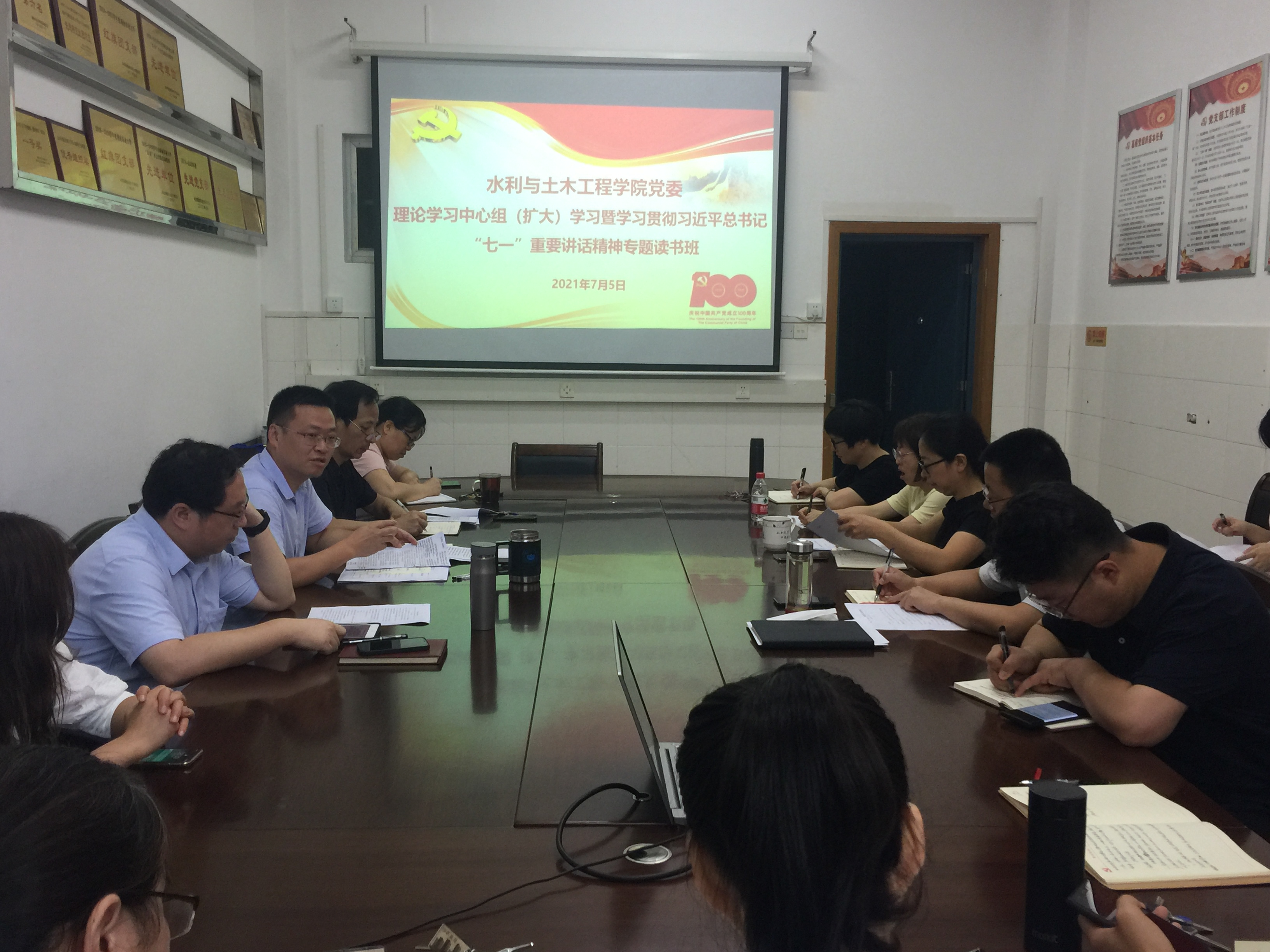 本网讯(通讯员 翟光辉)7月5日上午,水利与土木工程学院召开党委理论学习中心组(扩大)会议,以读书班和集体研讨的形式深入学习贯彻习近平总书记在庆祝中国共产党成立100周年大会上的重要讲话精神。会议由学院党委书记胡德勇主持,学院党委理论学习中心组全体成员、各系(办)负责人、各党支部委员参加。