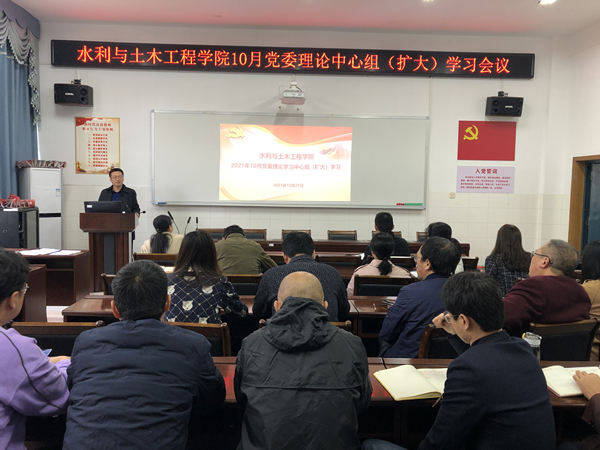 本网讯(通讯员 翟光辉)10月21日下午,水利与土木工程学院召开党委理论学习中心组(扩大)学习暨师德师风建设专题学习教育大会。会议由学院党委书记胡德勇主持,学院全体教职工参加。