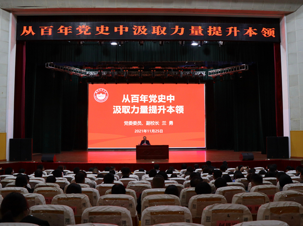 本网讯(通讯员 周 健 邹 亚)11月25日下午,校党委委员、副校长兰勇以“从百年党史中汲取力量提升本领”为题,为师生上党课。基建处、信息中心与后勤集团教工党员,商学院与水土院师生党员参加,商学院党委书记李阿利主持。