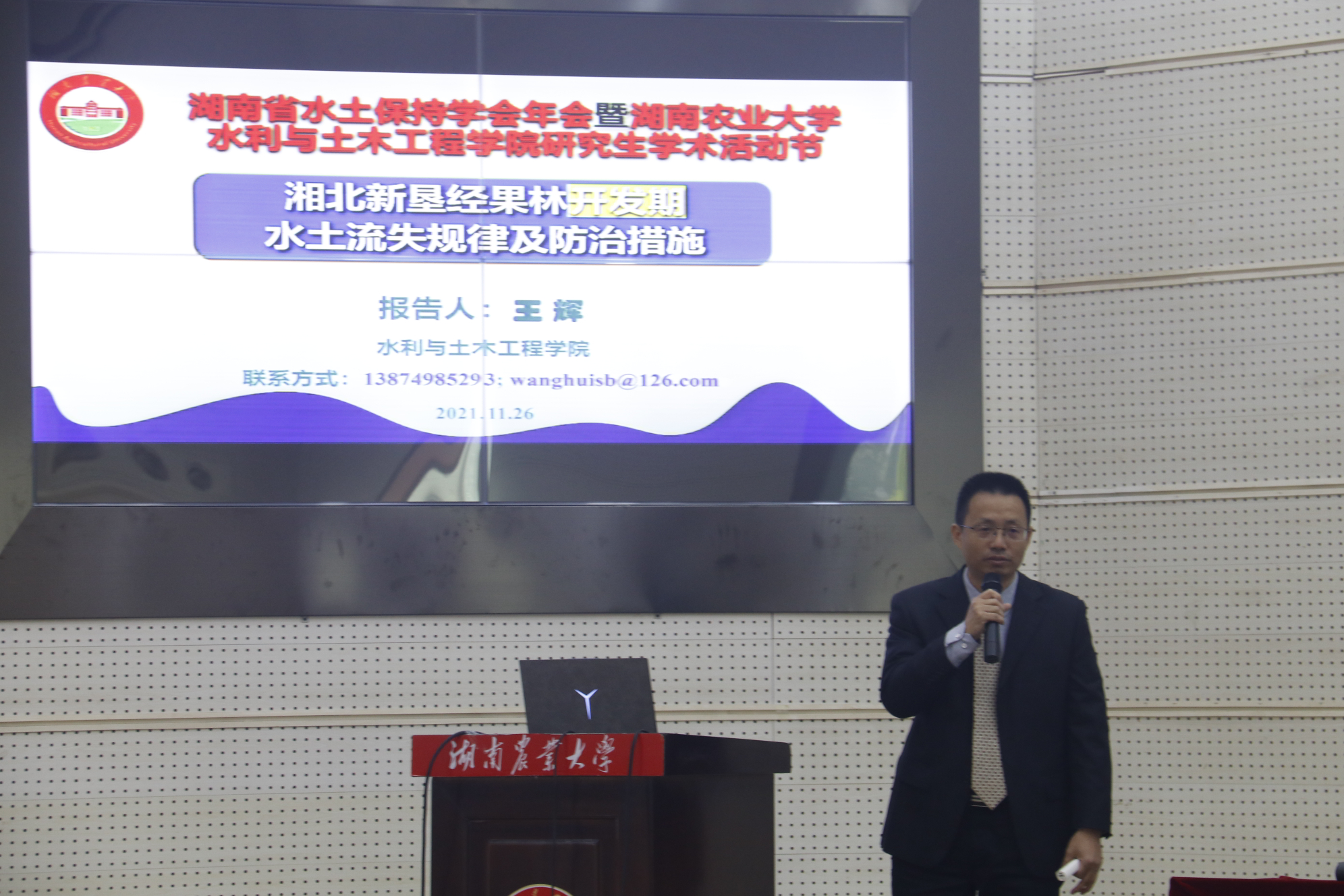 本网讯(通讯员 周锡玲、白东明)11月27日上午,以“水土保持助力乡村振兴,护佑绿水青山”为主题的湖南省水土保持学会2021年学术报告会暨湖南农业大学水利与土木工程学院研究生学术科技节开幕式在图书馆大成厅召开。湖南省水土保持学会理事长周柏林、湖南农业大学党委委员、副校长兰勇出席报告会并致辞,副理事长殷国仕主持报告会。水利与土木工程学院全体教师、研究生、部分水利、水利特岗专业的本科生参加了报告会。