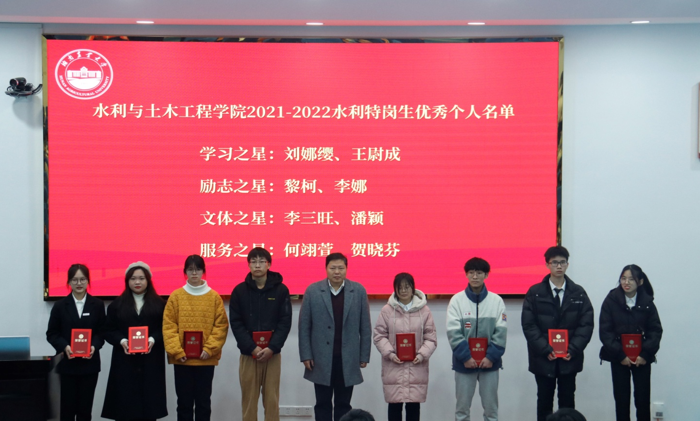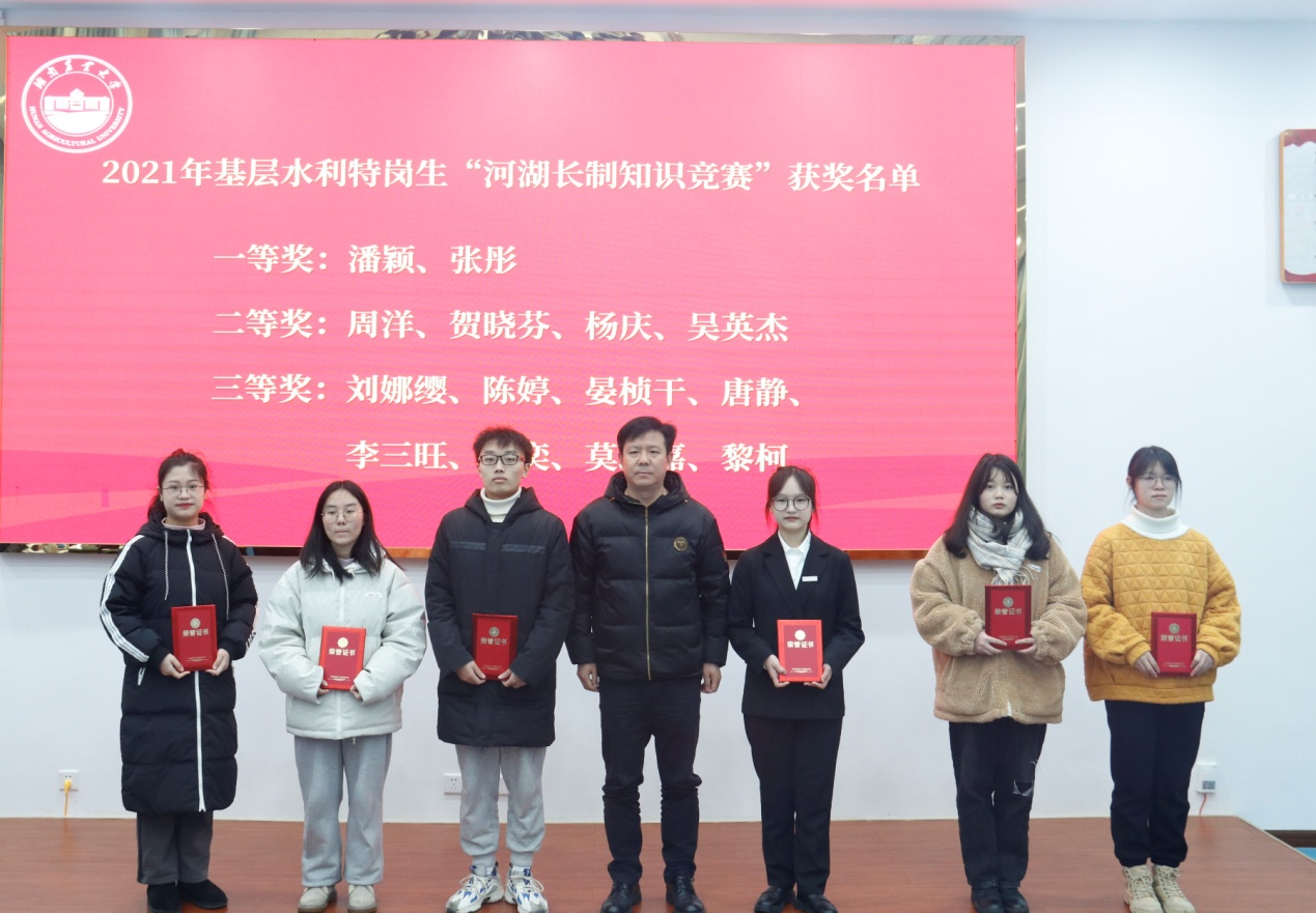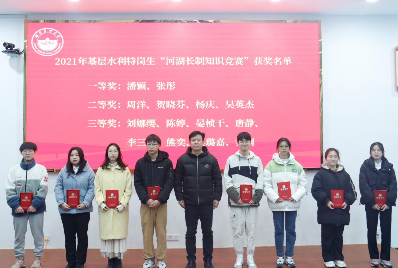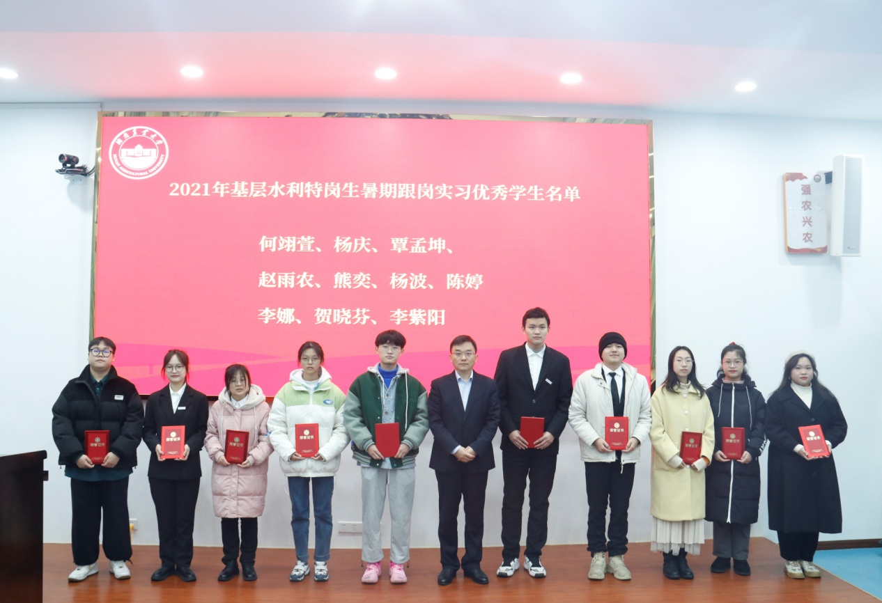表彰环节,唐要善为荣获2021年学习之星、励志之星、文体之星、服务之星的基层水利特岗生颁奖,蒋龙华为2021年暑期跟岗实习优秀基层水利特岗生颁奖,程道国为2021年基层水利特岗生“河湖长制知识竞赛”获奖同学颁奖;董国生和李小湄为2021年基层水利特岗生“践行初心,绽放青春”演讲比赛获奖学生颁奖。