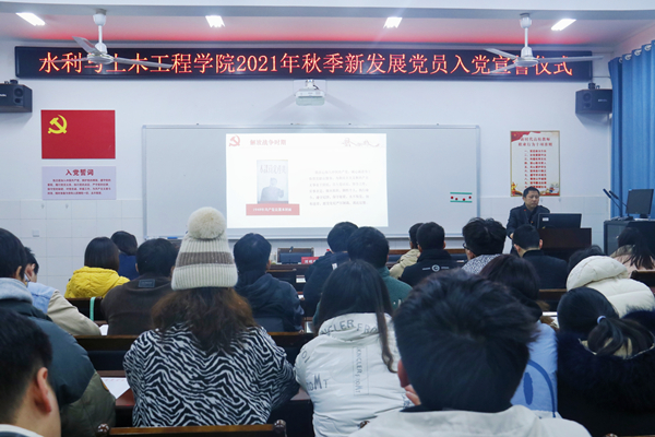 活动分三个环节。在“一字一句”诉说誓词演变环节,学院正处级专职组织员刘峻峰为新党员上党课,讲述《中国共产党入党誓词的历史沿革》,分别从建党、抗战、解放战争、新中国成立和改革开放五个时期介绍入党誓词的演变过程。并就新党员如何在实际学习生活中践行入党誓词提出希望和要求。他强调,作为新党员,要做“政治上的明白人、纪律上的规矩人、学习上的带头人”。要始终坚定政治信仰、强化党性淬炼、压实政治责任;要做爱党爱国的坚定拥护者,做“两个维护”的坚定捍卫者;要认真学习党章、理解党章,把党章作为今后行动的根本遵循,把入党誓言作为今后的行动宣言,把思想自觉转化为行动自觉,充分发挥好党员的先锋模范作用。